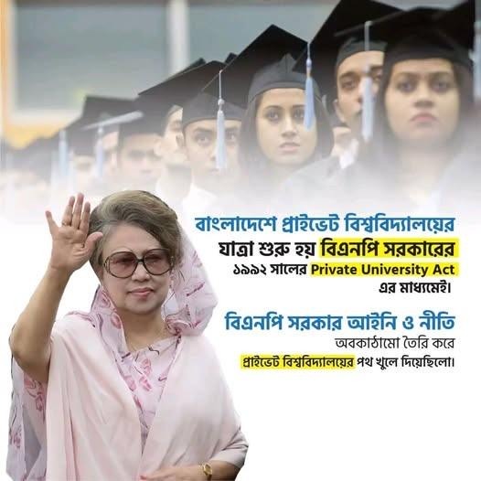 একই বছরের ২১ অক্টোবর প্রতিষ্ঠিত হয় ‘জাতীয় বিশ্ববিদ্যালয়’। আজ যা বিশ্বের দ্বিতীয় বৃহত্তম বিশ্ববিদ্যালয় হিসেবে স্বীকৃত এবং ৩০ লক্ষাধিক শিক্ষার্থীর উচ্চশিক্ষার একমাত্র নির্ভরযোগ্য ঠিকানা। মফস্বল ও প্রান্তিক পর্যায়ের সাধারণ মেধাবীদের উচ্চশিক্ষার আওতায় এনে বেগম খালেদা জিয়া প্রমাণ করেছিলেন যে, উচ্চশিক্ষা কেবল নির্দিষ্ট কোনো শ্রেণির একচেটিয়া অধিকার নয়, বরং এটি প্রতিটি নাগরিকের মৌলিক অধিকার। উন্নয়নের এই দর্শনটিই শহীদ জিয়ার ‘আধুনিক বাংলাদেশ’ গড়ার স্বপ্নের সার্থক প্রতিফলন।
