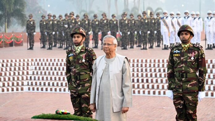 মহান বিজয় দিবসে জাতীয় স্মৃতিসৌধে বীর শহীদদের প্রতি শ্রদ্ধা জানিয়েছেন প্রধান উপদেষ্টা ড. মুহাম্মদ ইউনূস। মঙ্গলবার (১৬ ডিসেম্বর) সকাল ৬টা ৫৭ মিনিটের দিকে ফুল দিয়ে বীর শহীদদের প্রতি শ্রদ্ধা জানান।