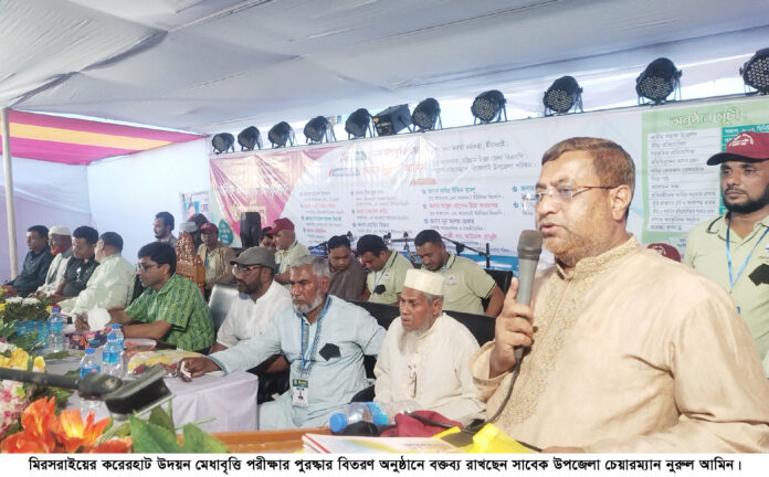 চট্টগ্রামের মিরসরাইয়ে স্বর্ণপদক প্রাপ্ত স্বেচ্ছাসেবী সংগঠন করেরহাট উদয়ন ক্লাব আয়োজিত উদয়ন মেধাবৃত্তির পুরস্কার, সনদপত্র বিতরণ, প্রতিবন্ধিদের আর্থিক অনুদান প্রদান, ক্রীড়া ও সাংস্কৃতিক অনুষ্ঠান সম্পন্ন হয়েছে। রবিবার (২৪ ফেব্রুয়ারি) দিনব্যাপী এসব কর্মসূচি অনুষ্ঠিত হয়। বিকেলে আলোচনা সভা ও পুরস্কার বিতরণ অনুষ্ঠানে প্রধান অতিথির বক্তব্য রাখেন চট্টগ্রাম উত্তর জেলা বিএনপির যুগ্ম, আহবায়ক ও সাবেক উপজেলা চেয়ারম্যান নুরুল আমিন চেয়ারম্যান। উদয়ন ক্লাবের সভাপতি ছালেহ আহম্মদ ডিপটির সভাপতিত্বে ও সাধারণ সম্পাদক মো. আলমগীর হোসেন এবং দিদারুল আলমের যৌথ সঞ্চালনায় বিশেষ বিশেষ অতিথির বক্তব্য রাখেন মিরসরাই উপজেলা বিএনপির সদস্য সচিব গাজী নিজাম উদ্দিন, বারইয়ারহাট পৌর বিএনপির আহবায়ক দিদারুল আলম মিয়াজী, উপজেলা বিএনপির সদস্য সিরাজুল হক, করেরহাট ইউনিয়ন বিএনপির আহবায়ক রেজাউল করিম, সদস্য সচিব এয়াছিন মিজান, করেরহাট ইউনিয়ন জামায়াতের আমীর ফখরুল আলম, ইউনিয়ন বিএনপির যুগ্ম আহবায়ক জহির উদ্দিন বাবলু, আবুল হোসেন বাবলু, রেজাউল করিম নোমান। এসময় আরো বক্তব্য রাখেন উদয়ন ক্লাবের সহ-সভাপতি ফজলুল মুরাদ। অনুষ্ঠানে উপস্থিত ছিলেন উদয়ন ক্লাবের প্রতিষ্ঠাতা সভাপতি জানে আলম, সাধারণ সম্পাদক শওকত আলী, সাবেক সহ-সভাপতি দিলীপ কুমার বনিক, ইউনিয়ন জামায়াতের সাবেক সেক্রেটারী আসাদুল্লাহ, বিএনপিন নেতা এমরান হোসেন শামীম, ক্লাবের সাবেক ভারপ্রাপ্ত সভাপতি সাইফুল ইসলাম, সাবেক সাধারণ সম্পাদক মাকসুদ আলম শাহীন, সহ-সভাপতি এস.এম ফারুক হোসেন মামুন, সহ-সাধারণ সম্পাদক আনোয়ার হোসেন, ক্রীড়া সম্পাদক জিয়া উদ্দিন, শিক্ষা ও সাহিত্য সম্পাদক ফরহাদ হোসেন, সাংস্কৃতিক সম্পাদক নুরুল করিম রুবেল, কার্যকরী পরিষদ সদস্য নাজিম উদ্দিন, দিদারুল আলম, আব্দুর রহমান বিশ্বাস, মিজান উদ্দিন।